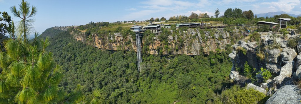 En Graskop, intentamos visitar la Ventana de Dios, pero estaba cerrada por huelga de los trabajadores. Luego hicimos la caminata no oficial del Jock Trail Parkrun, la cual termina con vista al Graskop Gorge Lift and Adventure Center. En este sitio el panorama es espectacular, hay un ascensor para bajar hasta el fondo del cañon y los más aguerridos pueden disfrutar experiencias extremas como el salto elástico desde el puente colgante entre otras actividades más o menos vertiginosas.