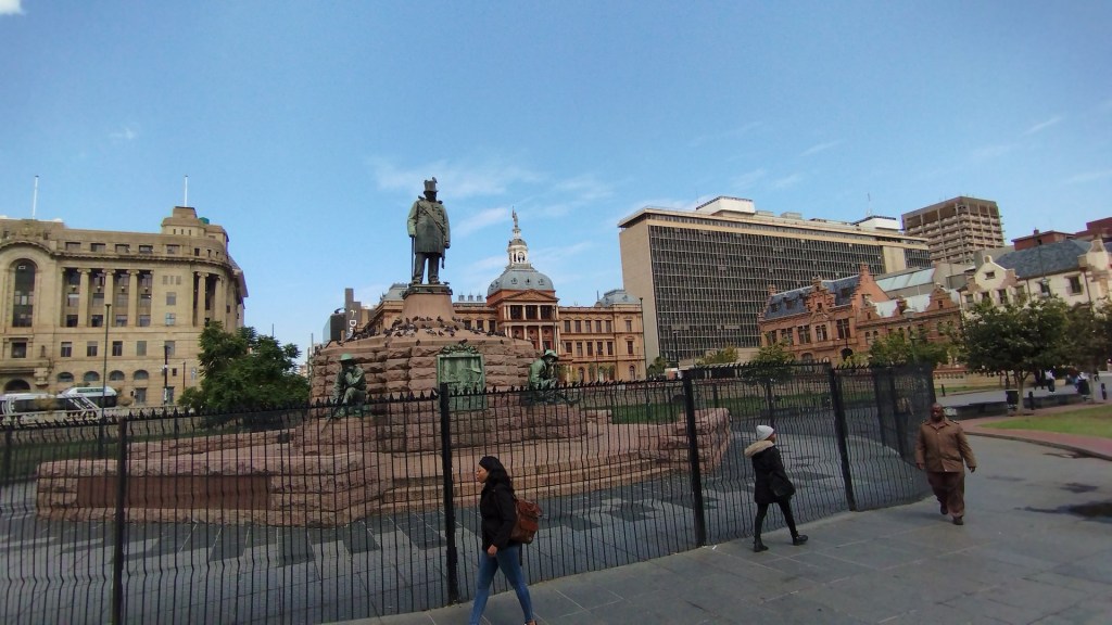 Apenas percibí el centro de la ciudad, sentí una mala vibra y deseaba abortar la visita, no me parecía un sitio seguro para pasear y menos con mi tesoro. Michel siguió adelante con el planning, recorrió y fotografió serenamente la Church Square, parecida a una plaza Bolívar pero con la estatua de Paul Kruger. Yo estaba bien molesta, caminando detrás como una guardaespaldas, mirando para todos lados.