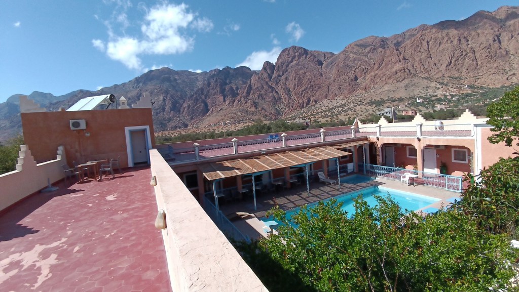 Llegamos a nuestro hotel BBB, L’Arganier d’Ammelne, nos recibe Abdullah, el joven y atento recepcionista, quien desde la terraza nos muestra una montaña, llamada la Cabeza del León. Nos tomó tiempo reconocerla. Una vez instalados también hacemos buenas migas con Majid, el simpático patrón. Una excelente experiencia de hospitalidad bereber.