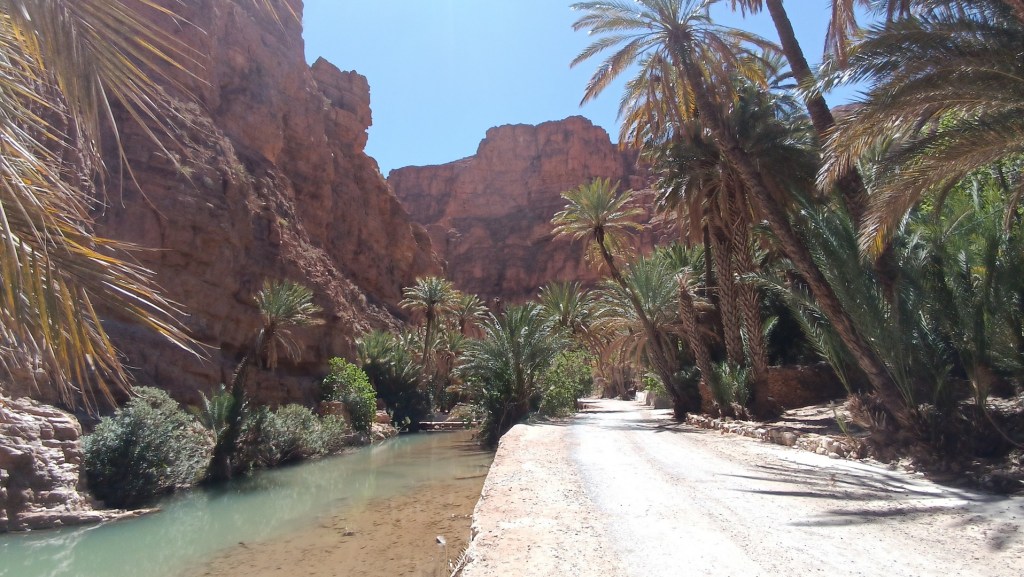 1) La mayoría de las personas que llegamos a este recóndito lugar de Marruecos venimos para visitar las gargantas de Ait Mansour. La ruta es angosta y magnífica, nos detenemos numerosas veces para contemplar el panorama. Al llegar, exploramos el cañon, es un hermoso oasis, el color del agua es turquesa, nos sorprenden las palmeras frondosas después de haber recorrido una zona bien arida. Hay ranas y algunos peces.