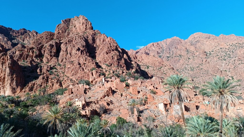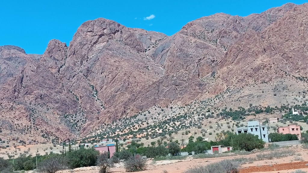Seguimos nuestra ruta. Las montañas me parecen hermosas, de las más bellas que he visto en mi vida. Son de tonalidades rosa y ocre con lunares verdes que resultan ser arganes y a lo lejos se divisan pequeñas aldeas de casas tradicionales en adobe que se confunden entre el paisaje.