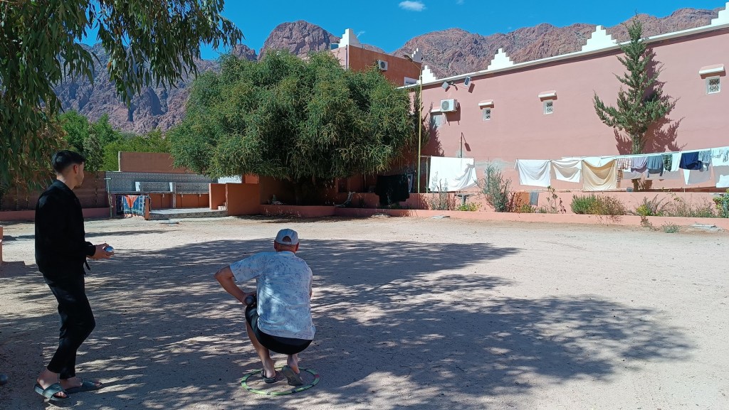 Tafraoute se encuentra a unos pocos kilómetros, vamos a dar una vuelta, es un pueblito muy armonioso, la infraestructura está en concordancia con los colores del entorno. Hay gran variedad de pequeños comercios, compramos una llave USB, una crema de argán para el cuerpo, galleticas típicas y frutas. Michel aprovechó para remendar un pantalón y cortarse el pelo. Antes del atardecer, las calles se vacían, las tiendas comienzan a cerrar, sus habitantes se preparan para el Iftar. Tafraoute volverá a animarse más tarde, los cafés se llenarán y en el Centro de la Juventud, se jugará el torneo de Fútbol del Ramadán. Nosotros volveremos con Majid para probar el terreno de petanca y medirnos con los atletas locales.