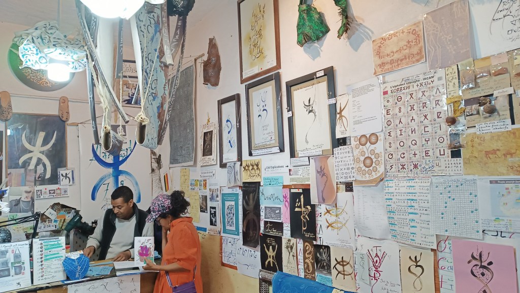Moulid nos recibe sonriente y  se toma el tiempo para  explicarnos con mucha pasión y  humor su arte, honrar la humanidad preservando  la cultura Amazigh mediante su alfabeto Tifinagh.