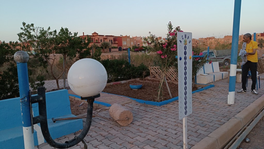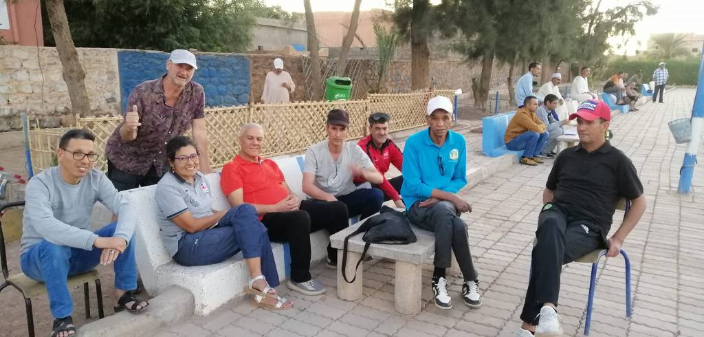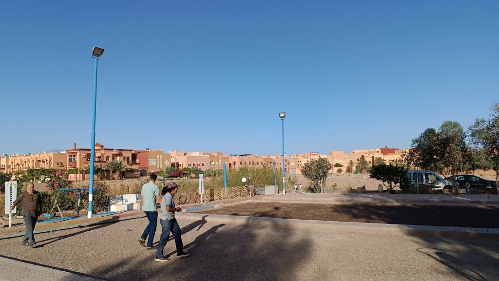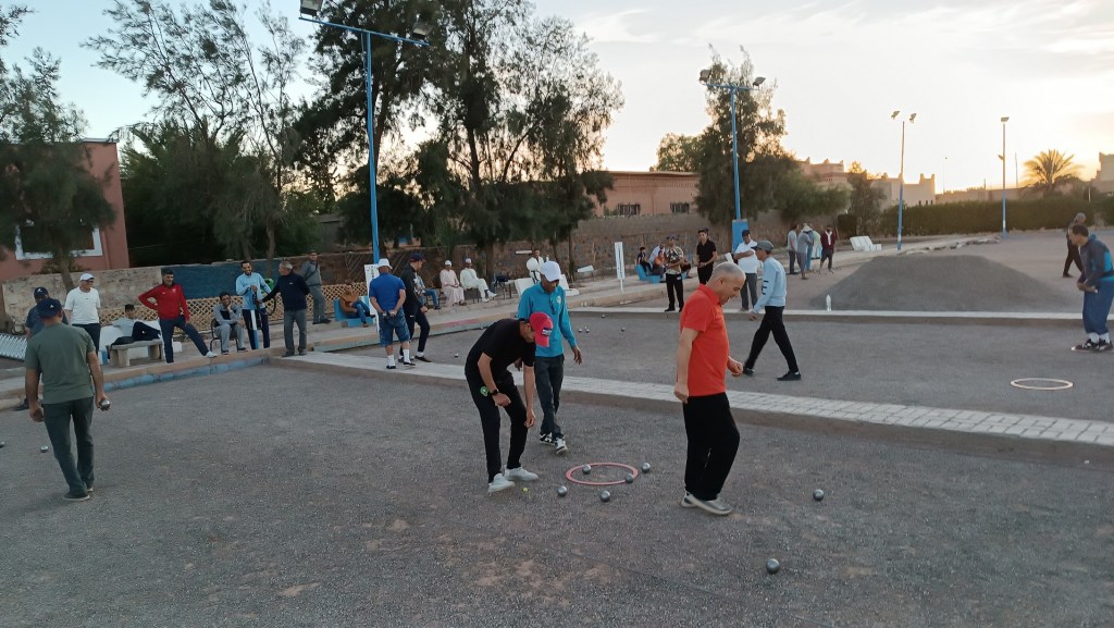 Saliendo de este recinto turístico, alguien nos llama, es Isdriss, un jugador de petanca que habíamos conocido el día anterior, es tallador de piedra del Centro Artesanal. Nos invita a su taller, nos muestra su trabajo y el de sus colegas. Nos comenta que se jugará un torneo amistoso por el fin del Ramadán. Nosotros queremos participar. Idriss hace un par de llamadas y listo, estamos inscritos, la cita es a las 5 de la tarde.