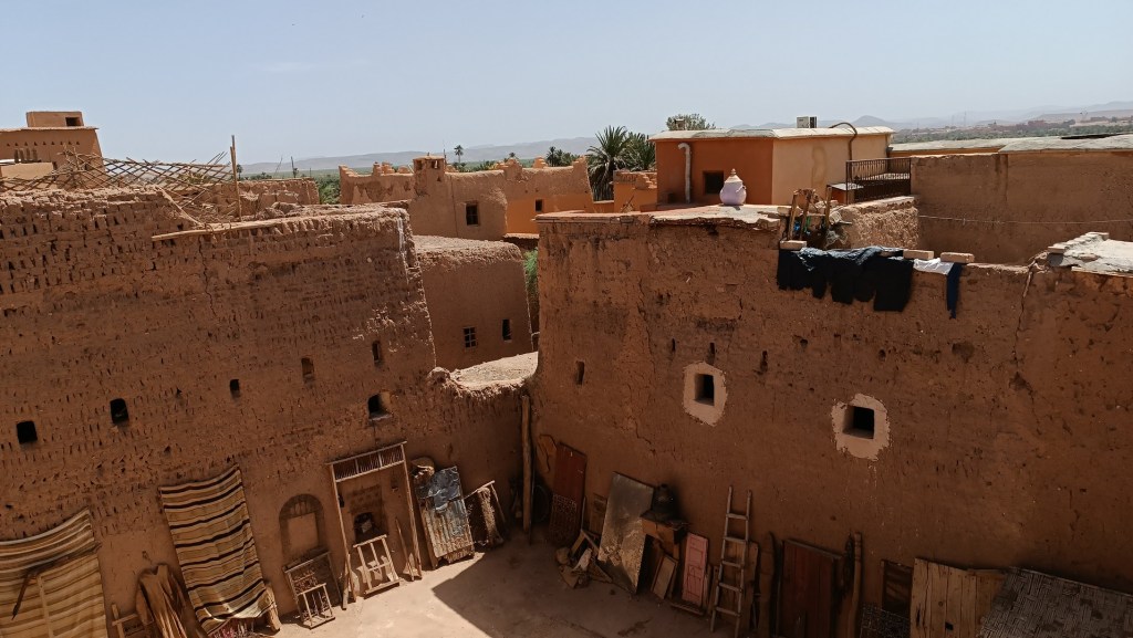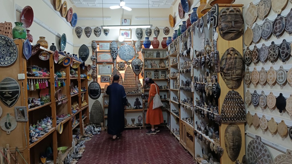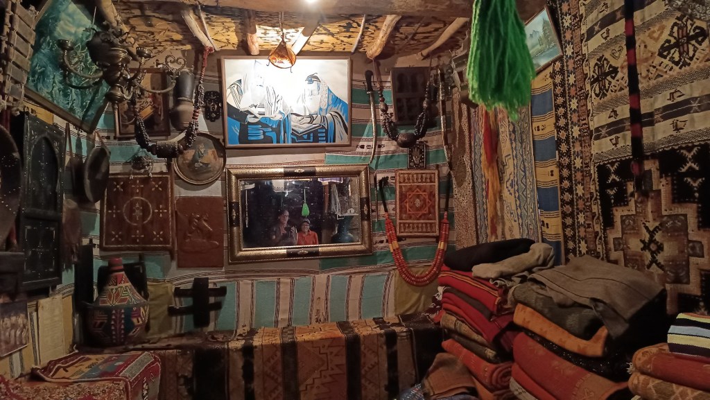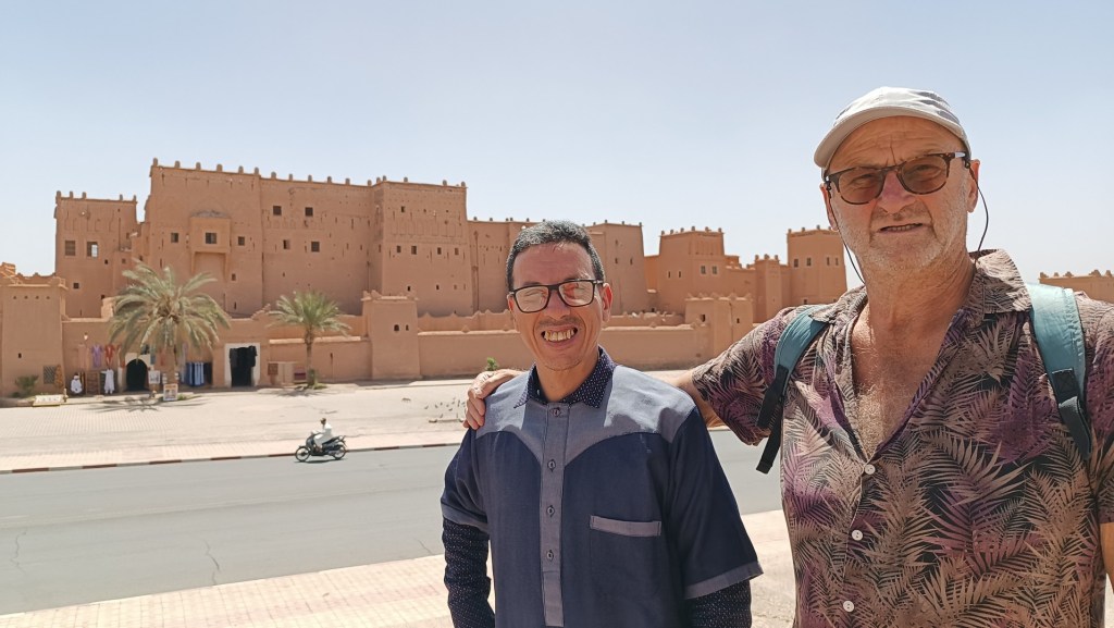 El Kasbah de Taourirt es un bellísimo castillo de arena bereber, cerrado al público después del terremoto ocurrido el año pasado. La visita de la antigua Sinagoga es interesante por su arquitectura y por la gran cantidad de artículos que están expuestos, un guía intenta explicarnos la historia del judaísmo en Marruecos, nos costó comprender su francés y nos pareció poco fehaciente. En el Museo del cine nos divertimos haciéndonos fotos en los diferentes escenarios, pero no teníamos idea en qué película figurábamos, pues no había ningún panel informativo y no somos cinéfilos.