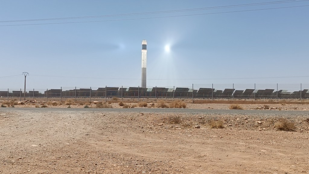 En el camino pasamos por la central Noor, una inmensa planta de energía solar, con medio millón de espejos alineados y una capacidad total instalada de más de 580 MW. No hay posibilidad de visitarla, nos contentamos con la vista de ciencia ficción desde afuera, en el cielo, nos encandila el punto mágico donde converge la luz.