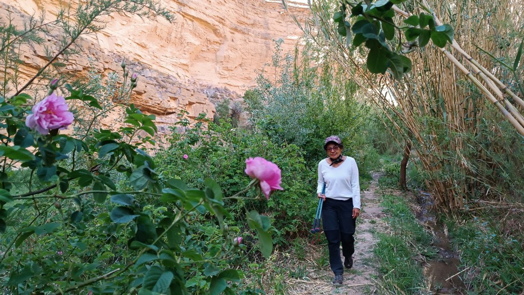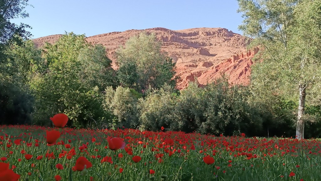 Hemos ganado algunos metros de altitud y perdido más de 10°C. De nuevo conseguimos las montañas rosadas pero esta vez decoradas en primavera, hay muchos capullos y algunas rosas precoces, los manzanos están en flor, el aroma a higos es una delicia, las amapolas florecen por doquier y nieva polen.