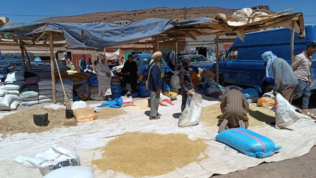 Llegamos al mercado en M’semrir, obviando un camello y la vestimenta de algunos en djellaba, podría tratarse de cualquier mercado en los Andes.