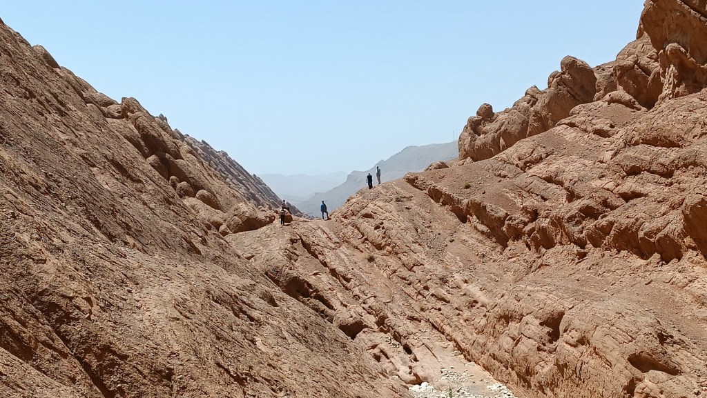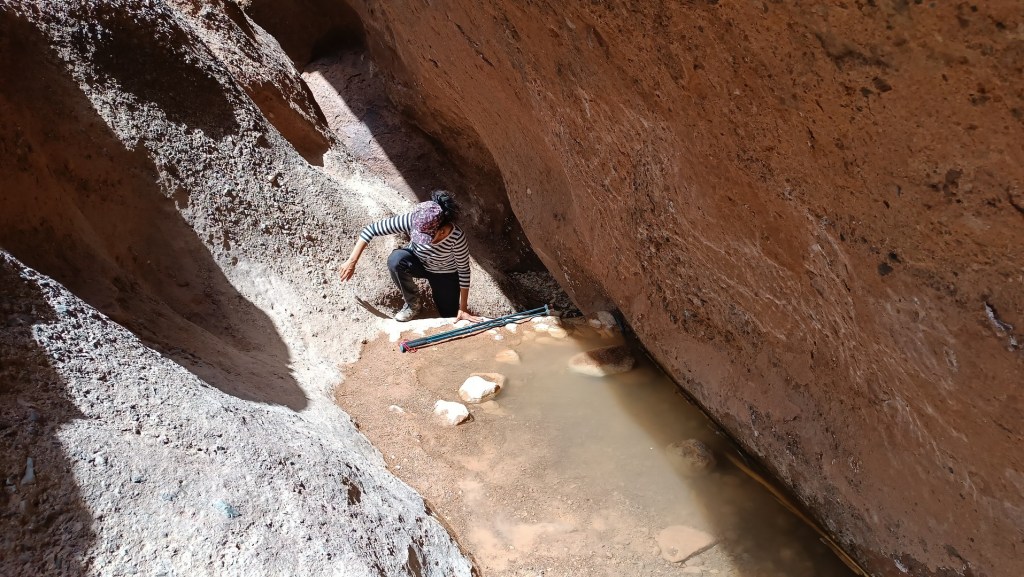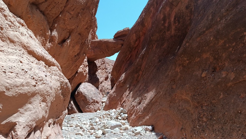 Llegamos casi al final del interior del cañón, cuando conseguimos una pareja de jóvenes alemanes, Ruth y Martin, conversamos y discutimos el trayecto. Hay que trepar unos 3 metros, arriba nos encontramos entre un desfiladero ancho entre 50 y 80 cm y profundo de unos 4m, a unos 15 metros del lado izquierdo se encuentra el paso en la cual, hay que secarse las manos, no mirar para abajo, agarrarse bien y dar un salto vigoroso para alcanzar el exterior del cañón.