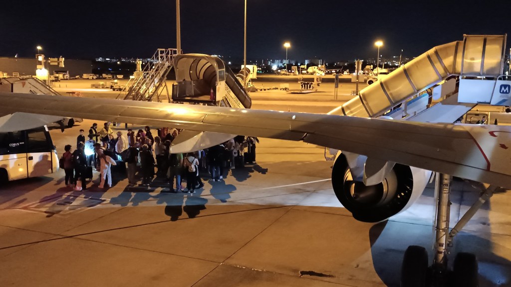 Casi a medianoche en la mitad de la pista, esperamos un rato mientras los otros pasajeros desembarcaron, algunos volvieron a subir por sus efectos personales.