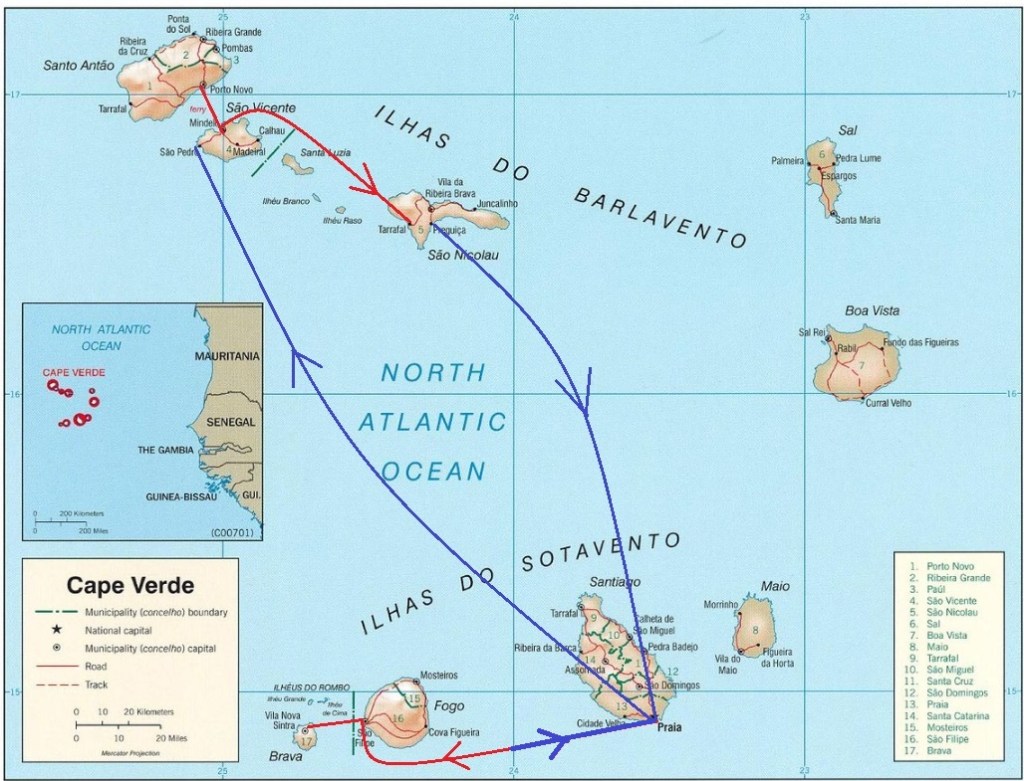 Visitamos seis islas en 44 días. Tres islas barloventeñas en 23 días: São Vicente, (9), Santo Antão (9), São Nicolau (5). Tres islas sotaventeñas en 21 días: Santiago (11), Brava (4) y Fogo (6).