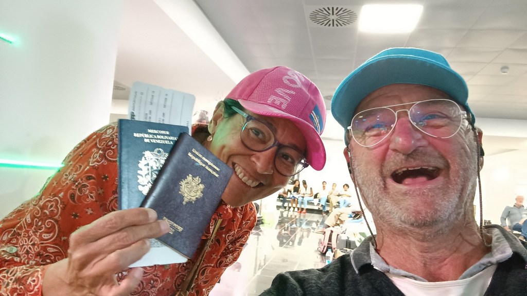 Durante los últimos días en Santiago, la historia del visado me tenía bastante cabezona. El día del regreso, nos fuimos temprano al aeropuerto. Hicimos el check-in y nos sentamos a revisar todos nuestros papeles. Michel estaba seguro de que no tendríamos problemas. Yo me encomendé a Dios para pasar la inmigración. Pasamos simultáneamente cada uno con una funcionaria diferente. Revisaron nuestras visas, preguntaron a un superior y nos estamparon el sello de salida en el pasaporte. ¡Qué alivio !