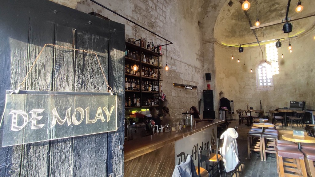Para finalizar el día de transgresión, nos fuimos al Bar De Molay en una antigua iglesia templaria. Jacques De Molay, último Señor de las Cruzadas, fue acusado de herejía, condenado en un juicio arbitrario y posteriormente quemado en una hoguera de París (1314).