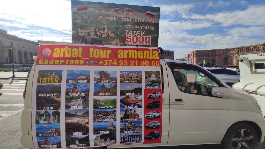 Como aún nos quedaba bastante tiempo antes del check in, nos fuimos caminando hasta la Plaza de la República, originalmente bautizada como Plaza Lenin. Quedamos encandilados por la luz radiante reflejada en los notables edificios de los tiempos soviéticos construidos con piedra rosa (toba volcánica). La plaza está rodeada de camionetas cubiertas con las fotos de los sitios turísticos. Intentaron vendernos sus paquetes. No les prestamos mucha atención.