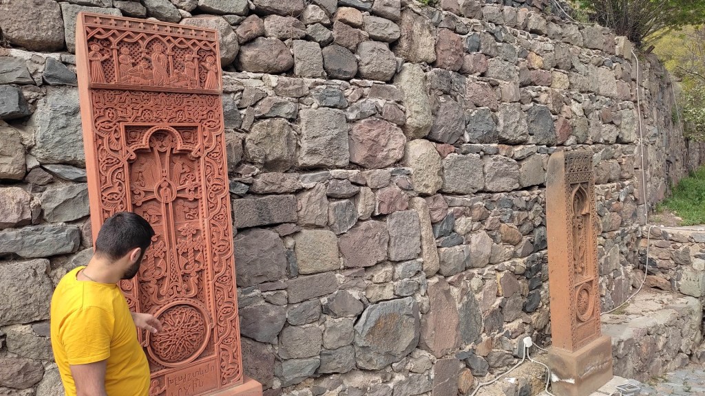Davit negoció un taxi para ir a Ghegard, nuestro primer monasterio armenio, uno de los más concurridos por su cercanía con la capital. Descubrimos los hermosos khachkars, cruces esculpidas en piedras rectangulares decoradas con gran cantidad de detalles geométricos y alegóricos.