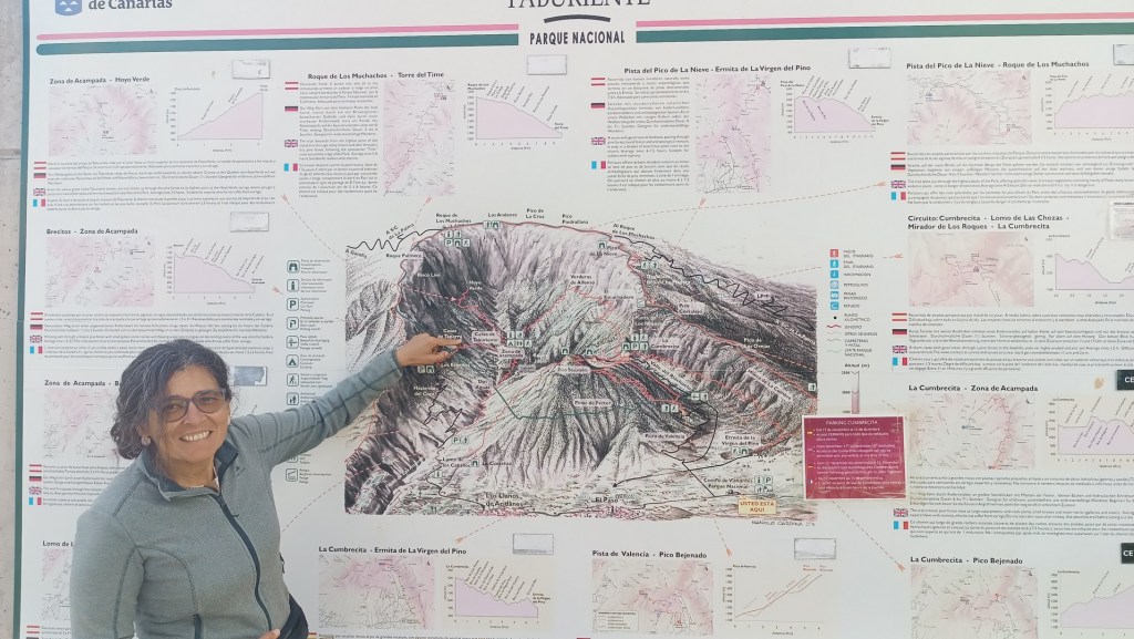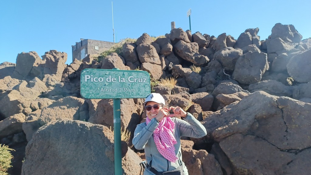 El Pico de la Cruz (2351 m), nos estacionamos junto a una camioneta de trabajadores que empiedraban el camino. Con los cielos despejados, desde este belvedere disfrutamos nuestra primera vista aérea hacia el interior de la caldera, es una belleza, me doy una vuelta y me emociono al contemplar el Teide entre las nubes. Recuerdo a mi querida amiga Alexandra La Cruz y me retrató en su honor.