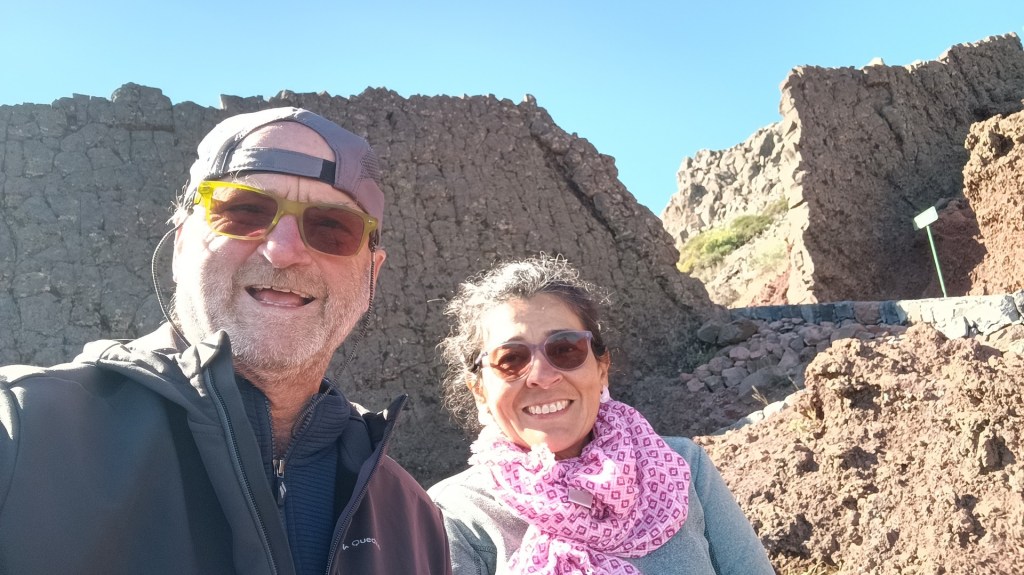 El Mirador de Los Andenes, desde acá caminamos hasta la Pared de Roberto. El 4 de diciembre es el aniversario de nuestra aventura en Fogo, en la mañana, nuestros amigos Olivier y Silvie nos los habían recordado, con una foto y una nota sobre la Pared de Roberto, lugar donde habían acampado en el 2011. Ellos sí completaron El Bastón. Es una pared de una colada de lava vertical que parece un muro. Desde acá ya se vislumbra la cumbre en su esplendor.