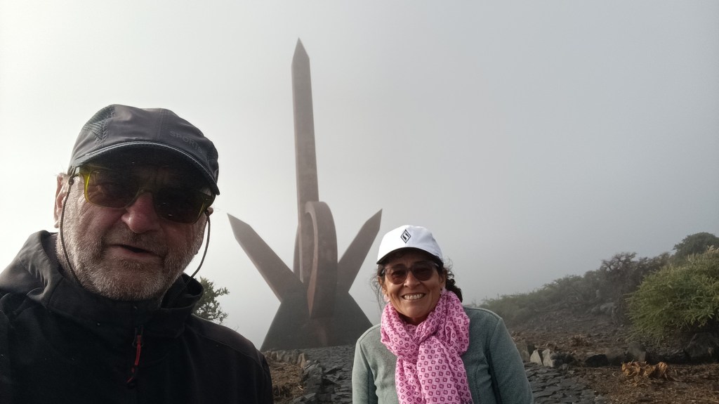 El Mirador del Infinito, bajo un cielo gris, nos recibe el imponente monumento diseñado por Cesar Manrique, para honrar la inauguración del Observatorio Astrofísico del Roque de Los Muchachos en 1985.