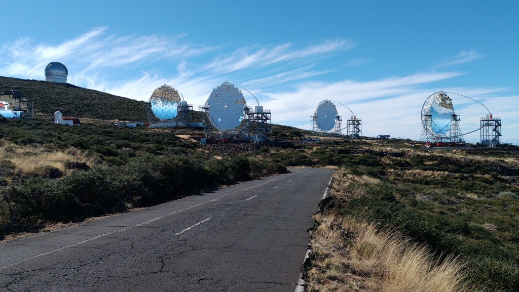 El Roque de los muchachos. Nos apuramos pero la vista delante nos frena, Michel se detiene en la carretera para fotografiar una batería de telescopios gigantes, me parece estar escuchando el soundtrack de Odisea en el Espacio. Estamos entrando a uno de los observatorios astronómicos más importantes del planeta. ¡Es increíble poder entrar a un lugar tan fantástico!