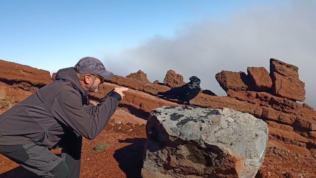 Otro mirador precioso, donde tuvimos nuestro primer contacto cercano con un cuervo canario. Estas aves son los simpáticos anfitriones de la crestería de la caldera.